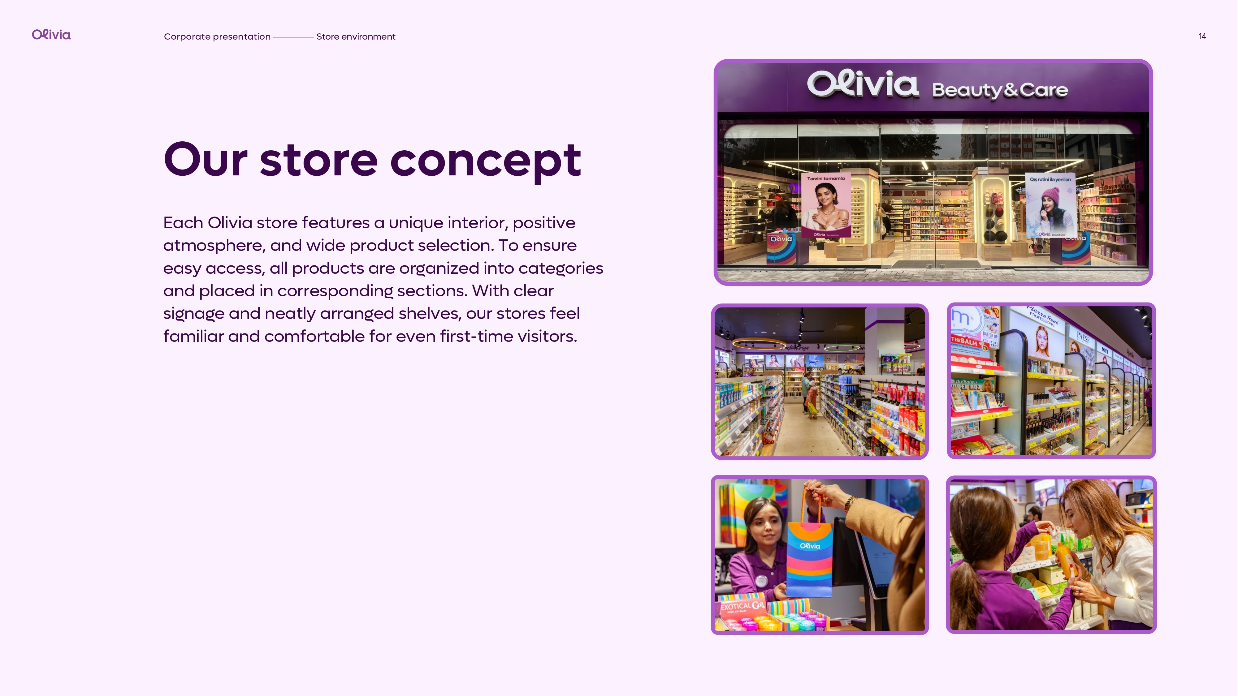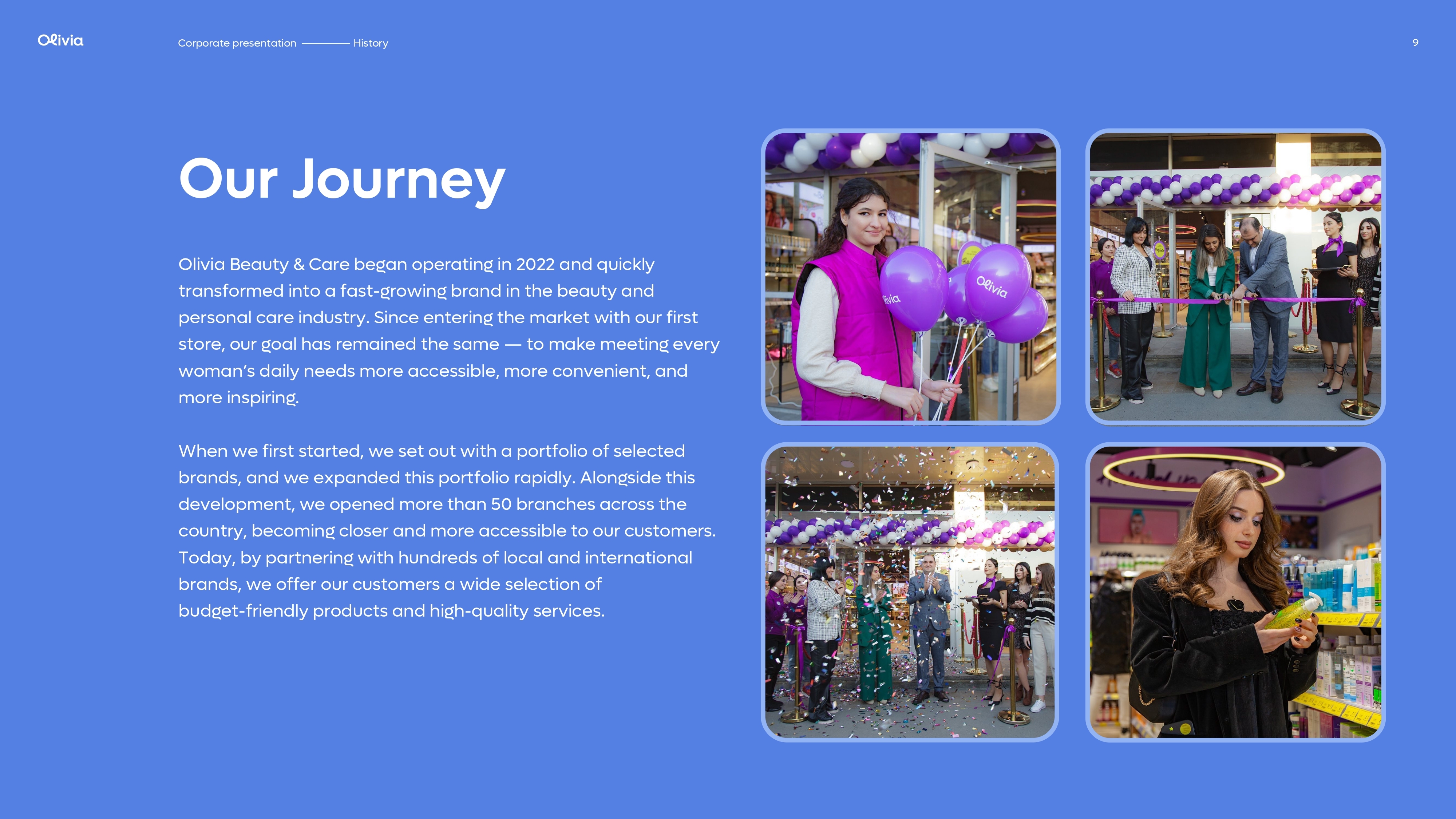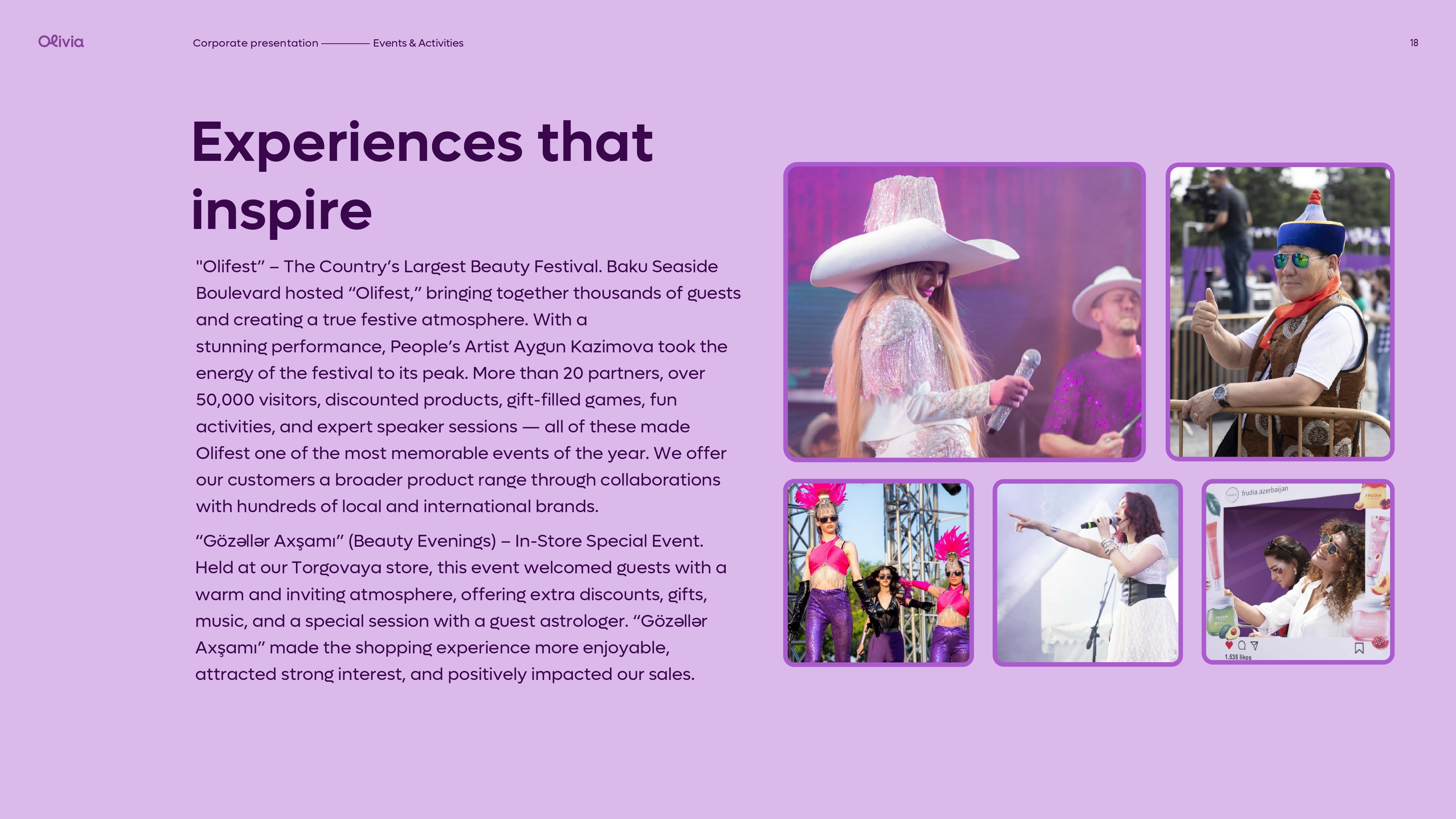 Qısa müddət ərzində Olivia Azərbaycanda gözəllik və baxım sahəsində yenilikçi yanaşması ilə seçilərək qadınların sevimlisinə çevrilmişdir. Bakı ilə yanaşı, Azərbaycanın müxtəlif bölgələrində fəaliyyət göstərən Olivia mağazaları sayəsində brend daha geniş auditoriyaya çatır və keyfiyyətli baxım hər qadın üçün əlçatan olur. Hər bir mağazada eyni peşəkar yanaşma və diqqətlə seçilmiş məhsul portfeli təqdim edilir.