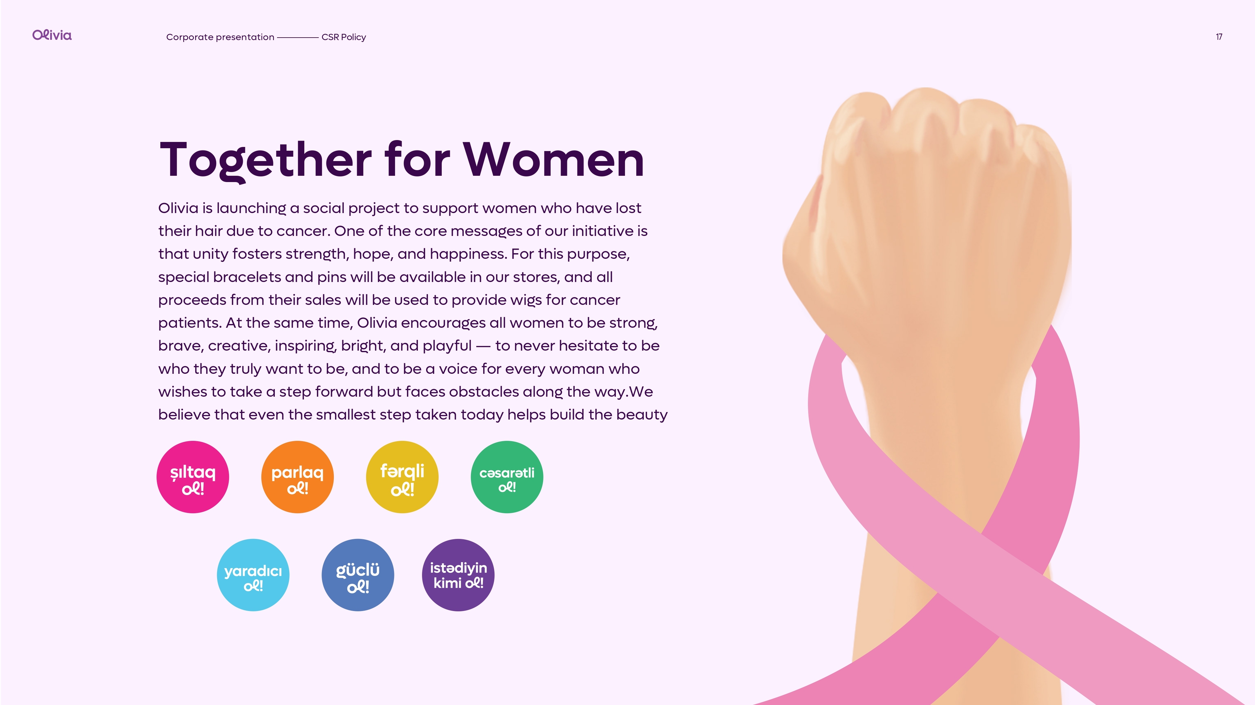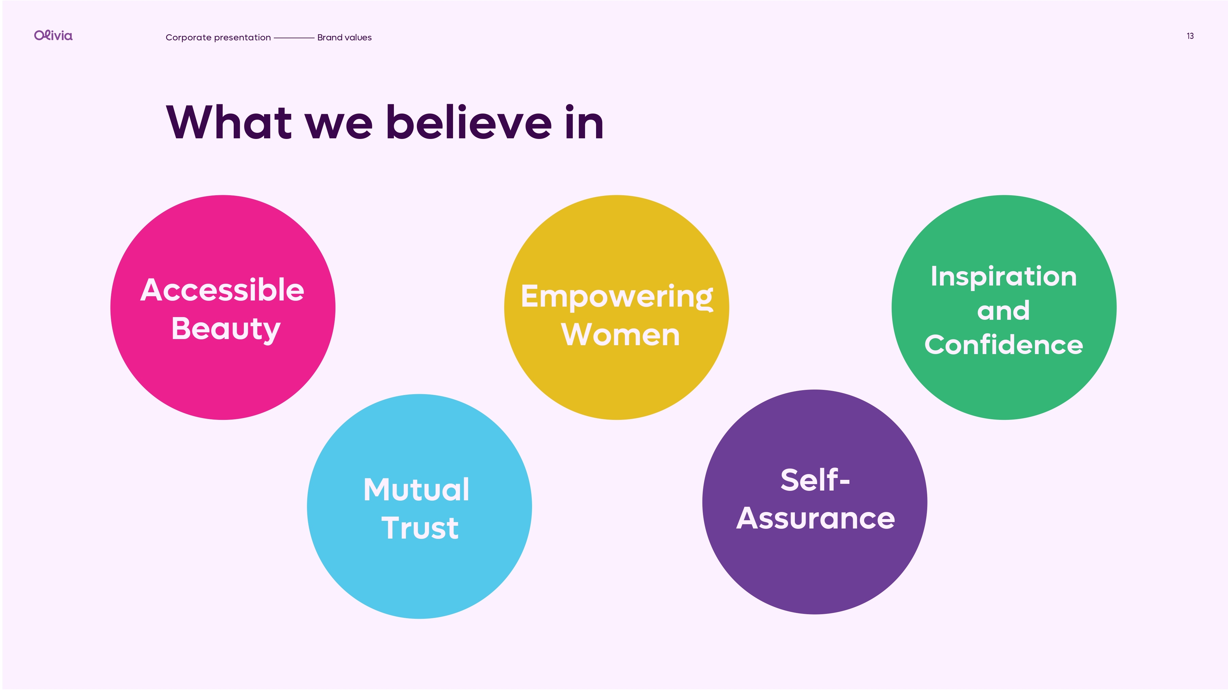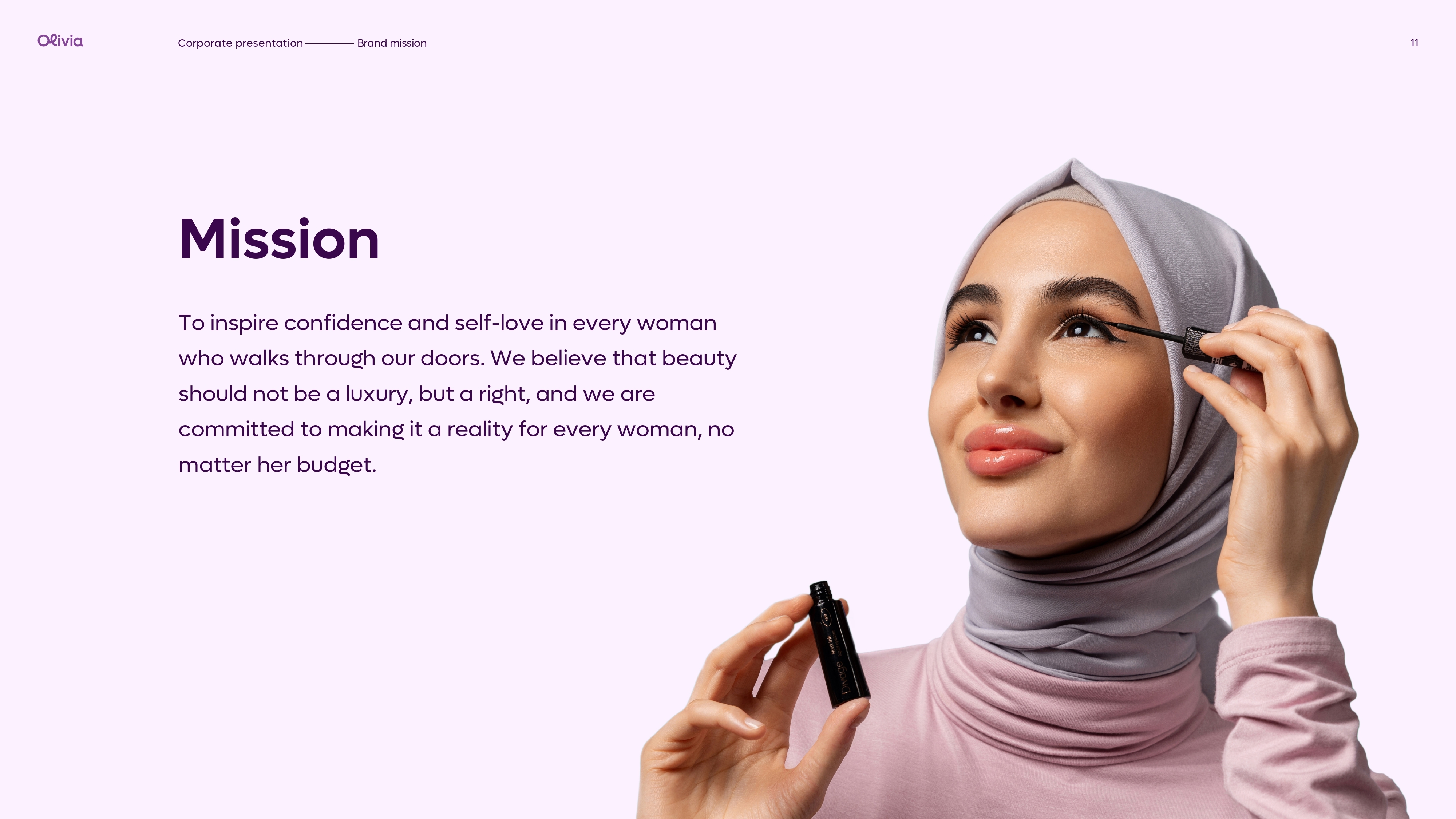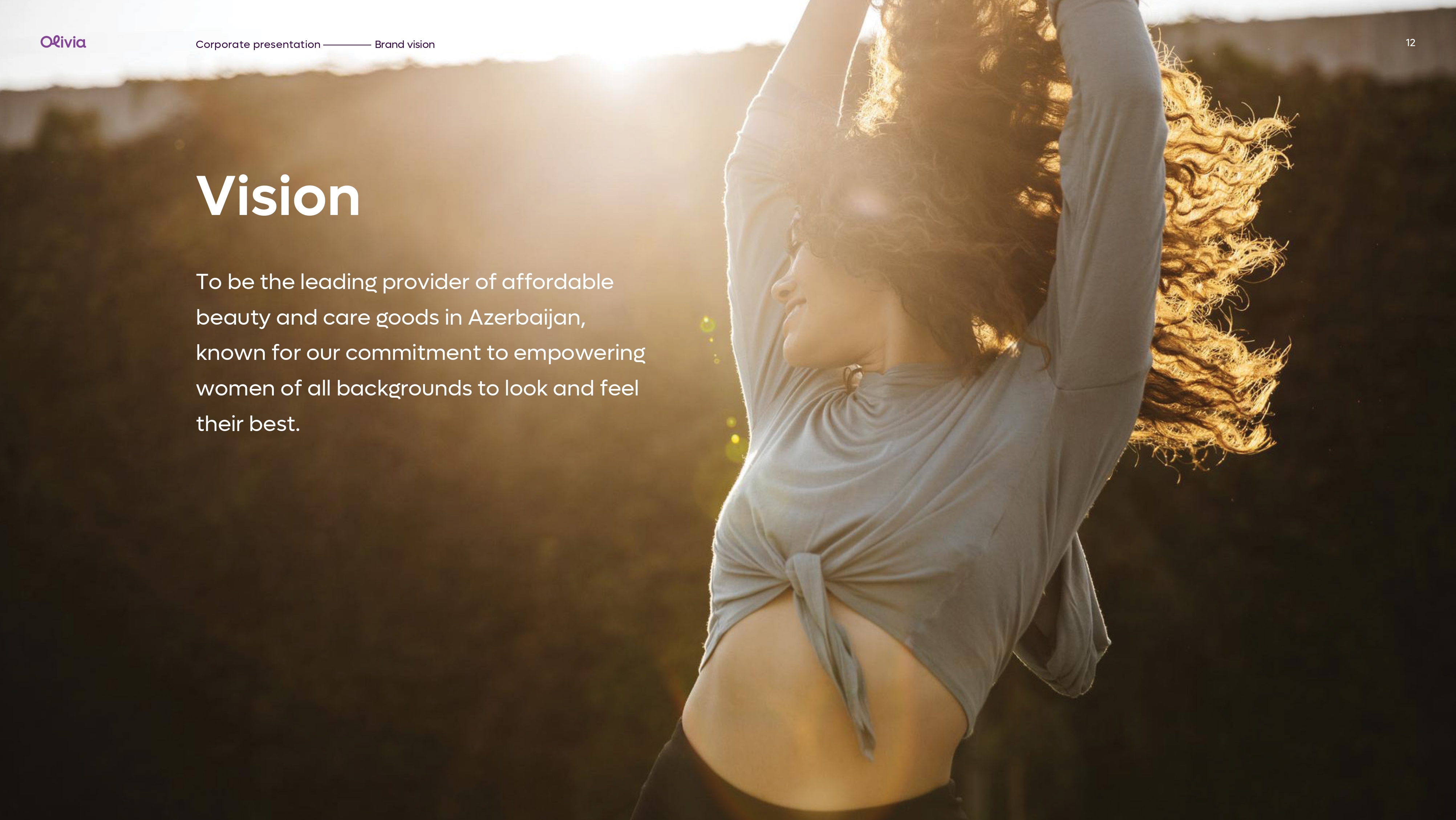 Şirkət olaraq yanaşmamız sadə və aydındır: hər qadın öz tərzini, gözəlliyini və baxım anlayışını özü müəyyən edir. "Olivia Beauty & Care" qadınlara istədiyi kimi olmaq azadlığını verən məhsul seçimləri təqdim edir və hər yaşda, hər peşədə olan qadınların gündəlik və xüsusi baxım ehtiyaclarına uyğun həllər yaradır. Gözəlliyin standartlara deyil, fərdiliyə əsaslandığına inanırıq.