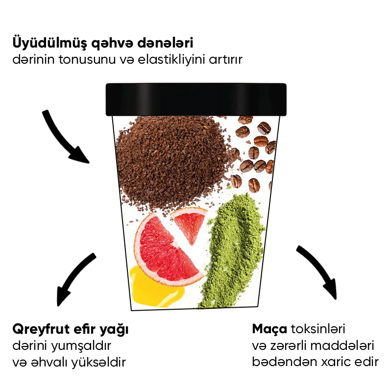 Bu skrabın əsas tərkib hissəsi – orijinal yaşıl americano qəhvəsi – dərini dərinlikdən təmizləyir və ona təbii parlaqlıq qazandırır. Qəhvə, ölü hüceyrələri aradan qaldırmaqla yanaşı, qan dövranını stimullaşdırır və dərinin tonunu bərpa edir. Tərkibindəki aktiv maddələr dərini yumşaldır və onun daha sağlam görünməsinə kömək edir.