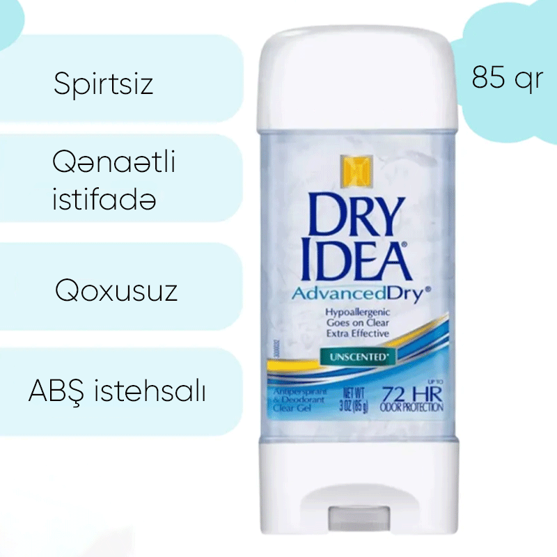 Dezodorant stik ətsiz Dry Idea-nı seçərək, gün boyu təzəlik və etibarlılıq təmin edən etibarlı bir köməkçi əldə edirsiniz. Kiçik şeylərin sizi vacib işlərdən yayındırmasına imkan verməyin — rahatlığa və hərəkət azadlığına doğru bir addım atın. Bu dezodorant, hər hansı bir şəraitdə sizin etibarlı yoldaşınız olacaq. Onu sınayın və təzəliyin sadə və əlçatan ola biləcəyini görün!
