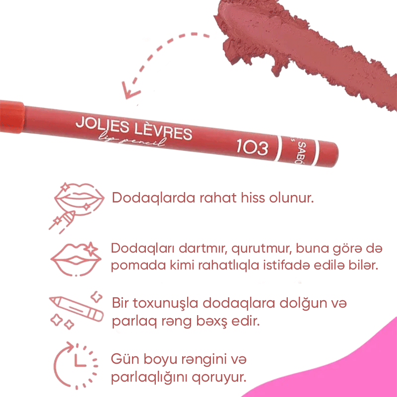 Vivienne Sabo Jolies Levres 103 dodaq qələmi sadəcə kosmetik vasitə deyil, gözəllik dünyasında sizin sadiq yoldaşınızdır. Hər hansı bir vəziyyətdə mükəmməl görünməyə kömək edəcək, sizə inam və rahatlıq bəxş edəcək. Dodaqlarınızı daha ifadəli və cəlbedici etmək üçün bu məhsulu kosmetik çantanıza əlavə etmək fürsətini qaçırmayın. Fransanın markası Vivienne Sabo-nun keyfiyyətini və stilini yaşamağa icazə verin!