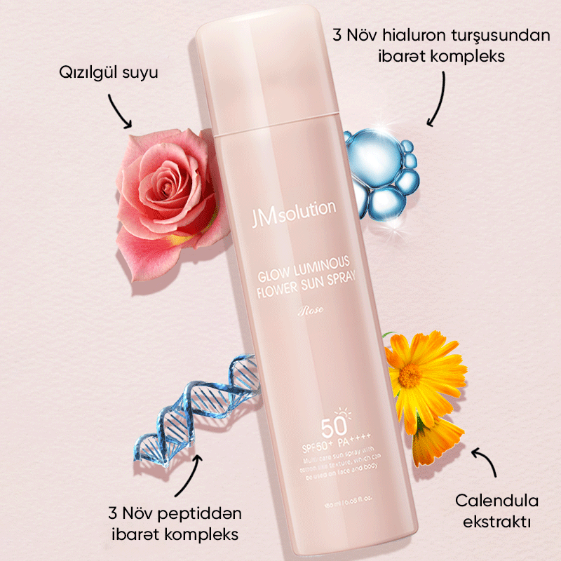 İndi JMSolution Glow Luminous Flower Rose SPF 50+ 180 ml spreyi sınaqdan keçir və günəşin zərərli təsirlərindən qorunmağın rahatlığını yaşa!